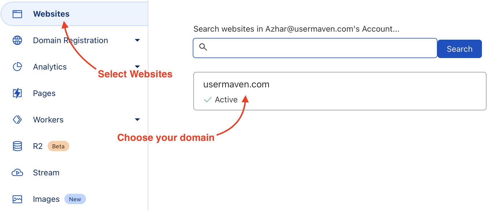 The first thing that you need to do is login to your Cloudflare account and then select your domain.